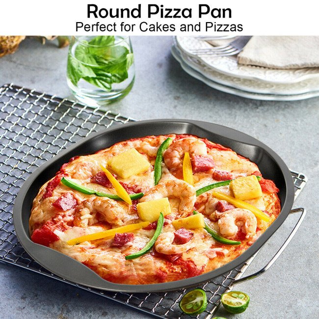 This set contains 1 crisper pan, 1 loaf pan, 1 round pizza pan, 1 cupcake tray, 1 small cookie sheet, 1 large cookie sheet, 1 roasting pan, 1 square cake pan, and 2 round cake pans, all of which are made of carbon steel with non-stick coating. Therefore, these pans not only have good rust resistance and thermal conductivity but also allow food to slide on and off smoothly. The dark black color also improves the quality and speed of the baking process. Besides, these pans are ideal for all kinds of cooking methods including cooking, baking, frying, roasting, steaming, poaching, stir-frying, etc. This professional-grade baking pans can withstand temperature from -40℉ to 446℉. The humanized designs, like extra-wide edges, easy-to-hold handles, make the baking pans easy to use.
