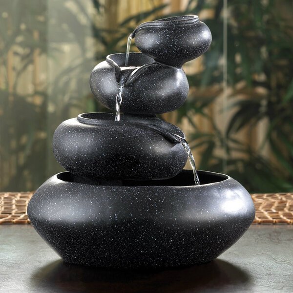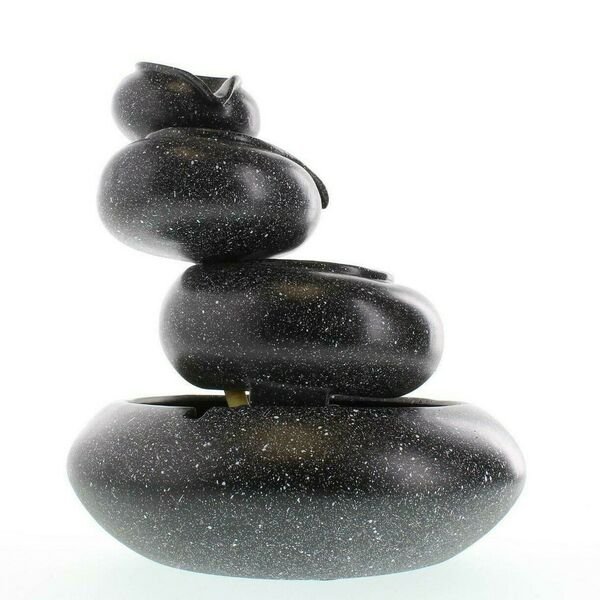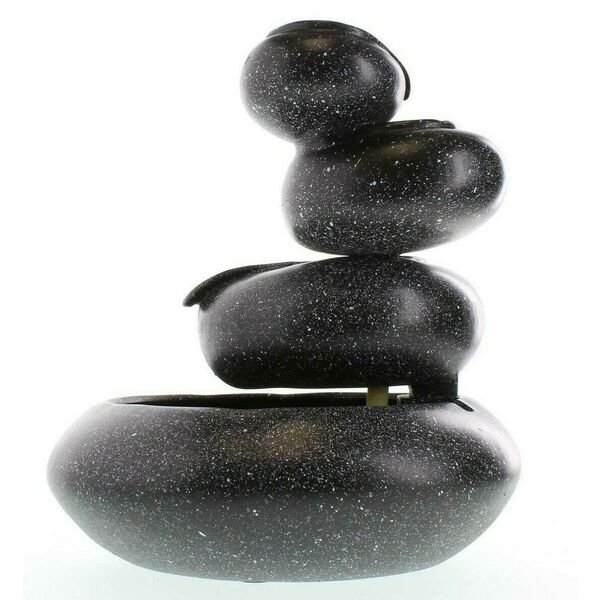 Bowls are finished with a speckled granite look. Water cascades from bowl to bowl. 120v pump included. For indoor use only. UL Recognized. Weight 6 pounds. 9.5 inches in diameter x 10 inches tall. Polyresin.