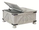 Double up on form and function with this square coffee table with storage. Its dual-lid tabletop provides easy access to the roomy storage space. Crafted with a distressed whitewash finish; crossbuck detailing and metal bracket appliques; this generously scaled coffee table is rustic farmhouse living at its best.Made of pine wood; acacia veneer and engineered woodDistressed whitewash finishMetal bracket accentsCrossbuck details2-sided hinged lift top (with stay arms)Assembly required
