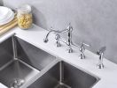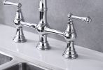 Two Handles Kitchen Faucet]Bridge kitchen faucet features 2-handle design and comes with supply hoses (cold&hot); which can help control water volume and temperature precisely. High arc 360° rotating faucet is also perfect for double sink.[Solid Brass Construction]The heavy-duty bridge faucet is made of premium solid brass and weighs 7.76 Ibs. Brass kitchen sink faucet with brushed nickel finish is rust; corrosion; leak-resistant; and ensures water safety and a long lifespan.[Brass Side Sprayer with Pull-Out Hose]With one push of a button; the high-pressure brass side sprayer can spray a strong stream of water to clean dishes and the dirt in the corner. The included hose can be pulled out to clean any position around the sink.[Easy Installation]Antique brass kitchen faucet is a beautiful addition to your kitchen. Vintage kitchen faucet comes with all necessary hardware and user instruction; which makes the installation easier with 30 minutes.Contact customer service for more high-quality picturesSpecifications:Finish:ChromeMaterial : Solid BrassSpout Type:SwivelFaucet Holes :4Number of Handles : 2Installation Type:WidespreadOverall Height:8.85 inchesSpout Height:6.29 inchesSpout Reach:7.08 inchesNet Weight:7.60 poundsGross Weight: 8.26 poundsFlow Rate:1.2 GPM / 4.5 LPMPackage Dimensions: 16.14x 13.58x 2.75inches