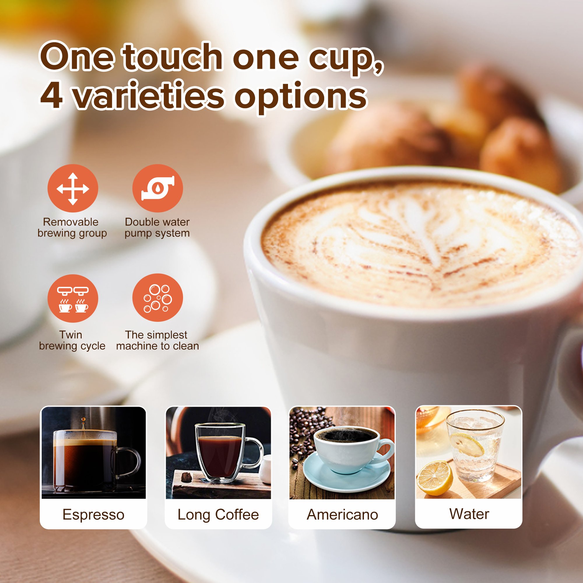 This coffee machine is designed and manufactured to make Espresso; Americano; Long Coffee and Hot Water