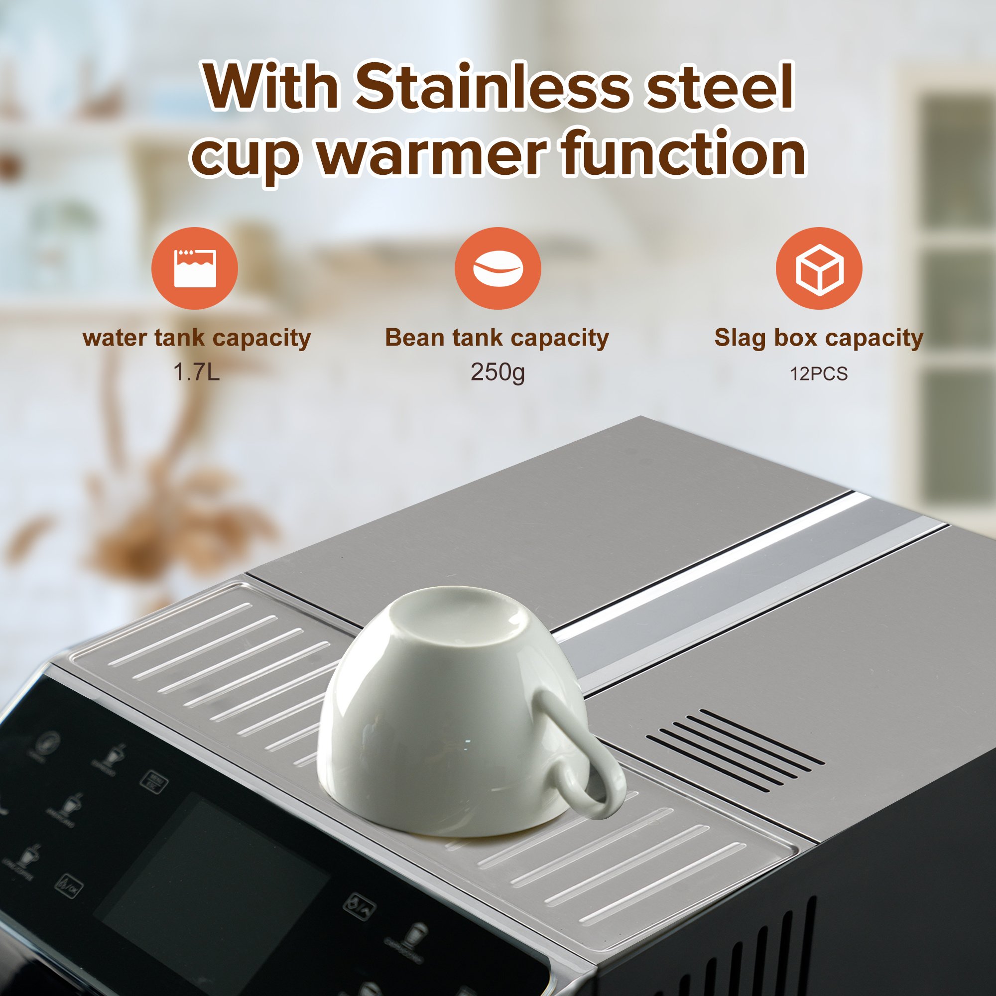 Features:1. Customize coffee powder amount2. Customize coffee dosage3. 6-step ginder adjustment4. Coffee bean and coffee powder dual use5. One key to restore factory settings6. Automatic record of brewing quantity7. The cleaning function is very important. The switch is automatically cleaned; the brewer can be taken out for cleaning; and the time can be set for automatic cleaning. 8. The metal cup warmer can guide the excess heat of the boiler to the top to play the cup warming function;9. There are lights at the coffee outlet; which is convenient for use in low-light environments. and the height of the water outlet can be adjusted according to the cup type; effectively preventing coffee dripping;10. When the coffee grounds are full; the system will automatically alarm when the number of brewing reaches 15 cups.11. If there is a shortage of water or beans; the screen will automatically prompt when the water tank is short of water or beans.12. 19 Bar strong group: fully extract the coffee oil; and then through the pre-brewing function; the coffee produced is rich in oil and has a fragrant taste13. Bevel gear grinder beans West and East: Coffee powder does not pass through any pipes to ensure that the coffee is made fresh14. LED display; stainless steel buttons.