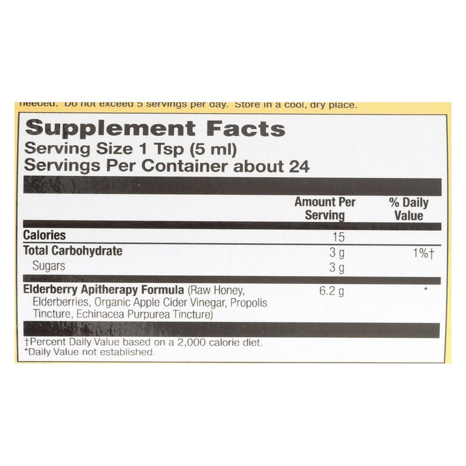 HONEY GARDENS TRADITIONAL IMMUNE FORMULA ELDERBERRY SYRUP HERBAL SUPPLEMENT PROVIDES YOU WITH A CUSTOM BLEND OF NUTRIENTS, INCLUDING RAW HONEY, APPLE CIDER VINEGAR AND PROPOLIS. TO USE, TAKE ONE TSP. EVERY TWO HOURS AS NEEDED. THIS BOTTLE CONTAINS 4 FL. OZ. OF ELDERBERRY SYRUP HERBAL SUPPLEMENT WITH APPROXIMATELY 24 SERVINGS.