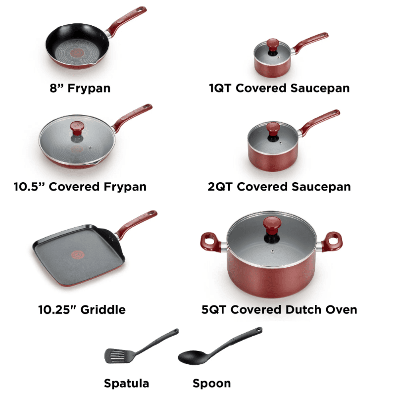 This cookware set includes 8" frypan; 10.25" frypan with lid; 10.25" griddle; 1QT saucepan with lid; 2QT saucepan with lid; 5QT stewpot with lid; spatula; and spoon.