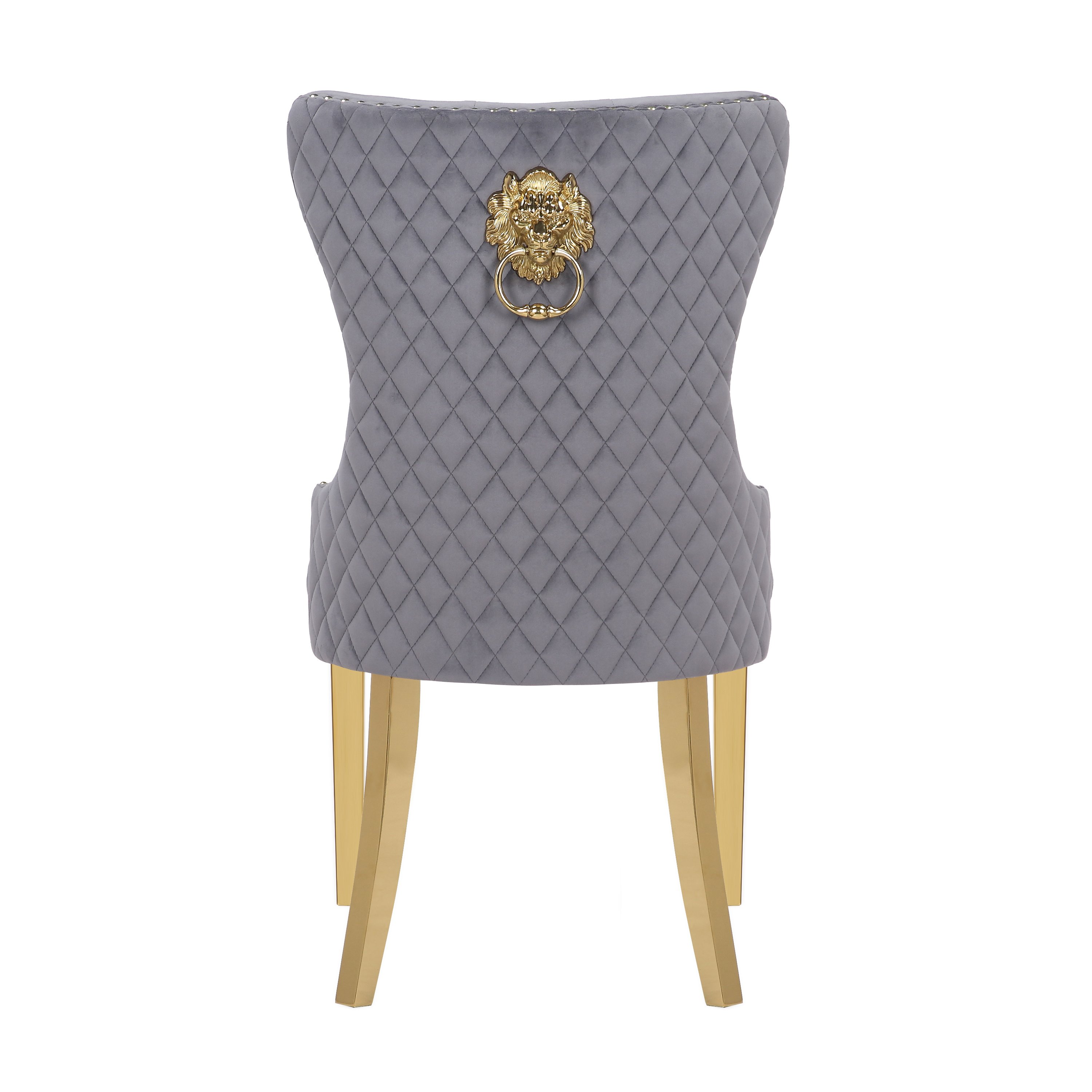 Sit down in comfort to eat with the stylish Simba velvet - Upholstered dining chairs providing the perfect feel and atmosphere complete with a sophisticated tufted finish with gold legs. The back is quilted to give a luxurious look. It has a golden lion head accent ring in the back. The Neil head application on the chair adds to the beauty of the chair.What's Included?2 Chair(s)FeaturesA Lion head accent ring in the backThe back is quilted to give a luxurious look.Gold legsProduct DetailsMain Material: UpholsteredMain Color (Dark Grey Upholstery Color): Dark GreyWeight Capacity: 220 lb.UpholsteredUpholstery Material: VelvetWeights & Dimensions· Overall: 40'· Seat: 20.86'' W x 18.11'' D x 19.00'' HSpecificationsFeatures· Leg Color: Gold· Main Material: Upholstered· Manufactured Wood Type: MDF· Leg Material: Metal· Upholstered: YesUpholstery Material: Velvet· Natural Variation Type: No Natural Variation· Weight Capacity: 220 lb.· Back Style: Wingback· Foldable: No· Wheels Included: No· Supplier Intended and Approved Use: Residential Use· Durability: Stain Resistant· Arms Included: No· Main Wood Joinery Method: DovetailAssembly· Level of Assembly: None· Adult Assembly Required: NoWarranty· Commercial Warranty: No