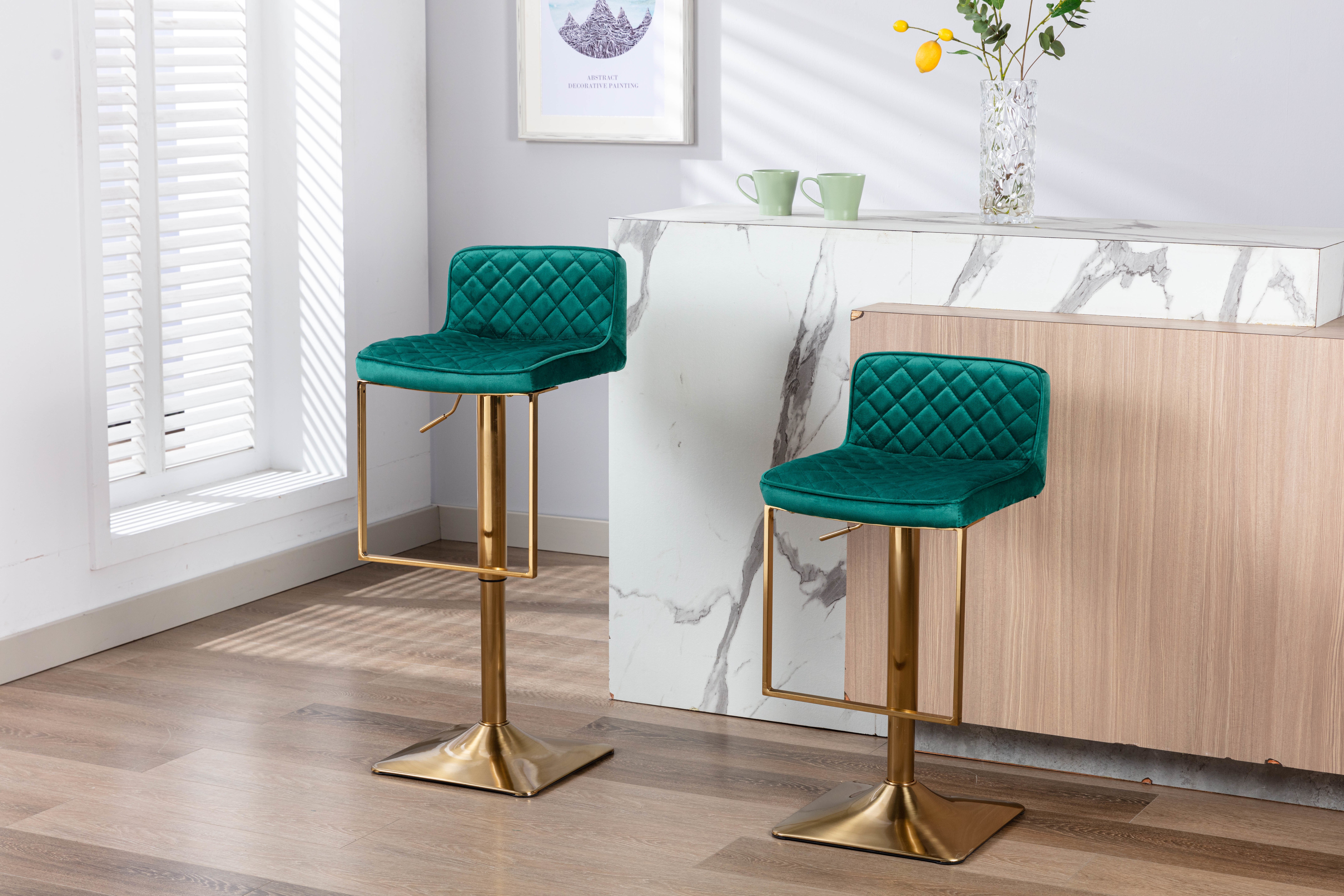 Stylish Modern Design: These bar stools combine the modern & classic style; which are perfect for your home; coffee shops; restaurant or any other decor theme. The charming bar chairs are very attractive; everyone who sees it will be full of praise.Super Comfort: The design of backrest and seat of streamlined ergonomic bar stools perfectly fits the human body curve; which relieves the pressure and provides the most comfortable sitting experience. You can also put your feet on the footrest to relax when sitting on the bar chairs.Adjustable Seat Position: The seat of bar stool can 360˚ swivel; you can switch directions freely to chat with your friends. The adjustable seat height will meet your personal needs; you can adjust to different seat height for various sitting position.Sturdy Construction: These bar stools are made by solid velvet for daily use. Not easy to break; and light; significantly increasing product life.The large base of the kitchen bar chairs provide great stability and durability. Maximum load capacity up to 250lbs.Risk Free to Purchase: It is easy to assemble this bar stool; and no extra tools are required to put it together. We provides 1 year warranty; if you have any quality problems of this bar chair; please do not hesitate to contact us.