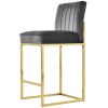 25'' Counter Height // Set of 2 // Velvet Upholstered Cushions //Metal Frame // Channel Tufted Backrest // Thick Sponge // Feet Pads // Multifunctional Occasions // Contemporary Aesthetic // Easy Assembly // 12-Month WarrantyBullet Points:[Gold Metal Frame]The polished gold stool frame is made of premium iron which is durable and sturdy. The capacity weight can hold up to 220lbs each. The stool legs are equipped with non-slip pads to prevent from wobbling and floor scratching. Lean against the high backrest and put your legs on the footrest to enjoy a piece of leisure and relaxed sitting experience.[Thick Velvet Upholstery]Designed for exceptional sitting experience; the chair cushions are packed with a 3.5'' thickness sponge one the seat and a 2'' thickness one on the back. Upholstered with soft velvet fabric; the surface is delicate to touch as well as be designed for elegance.[Wide Applications]How about bring your home a sense of chic and bright? The collection of glamorous gold and textured gray are matching with kinds of interior. The counter height dining chairs are suitable with bar area; kitchen island; dining room; counter and etc. These chairs are the perfect addition to your home. [Easy Assembly]Each package contains two stools as well as all the necessary assembly tools and detailed manual instruction. Each stool can be assembled well within 15-20 minutes by one person. [Dimensions and Warranty]Overall Size: 19*15.7*37inches (L*W*H); Seat to Floor: 25.2 inches; Back thickness:2inches. Warranty: 12 months. Notice: velvet can look different under certain lighting and its floss direction. Due to its reflective nature; this color may look lighter or darker based on the light in your home and if the fabric naps down or up. Please feel free to contact us if any issues.Product Description