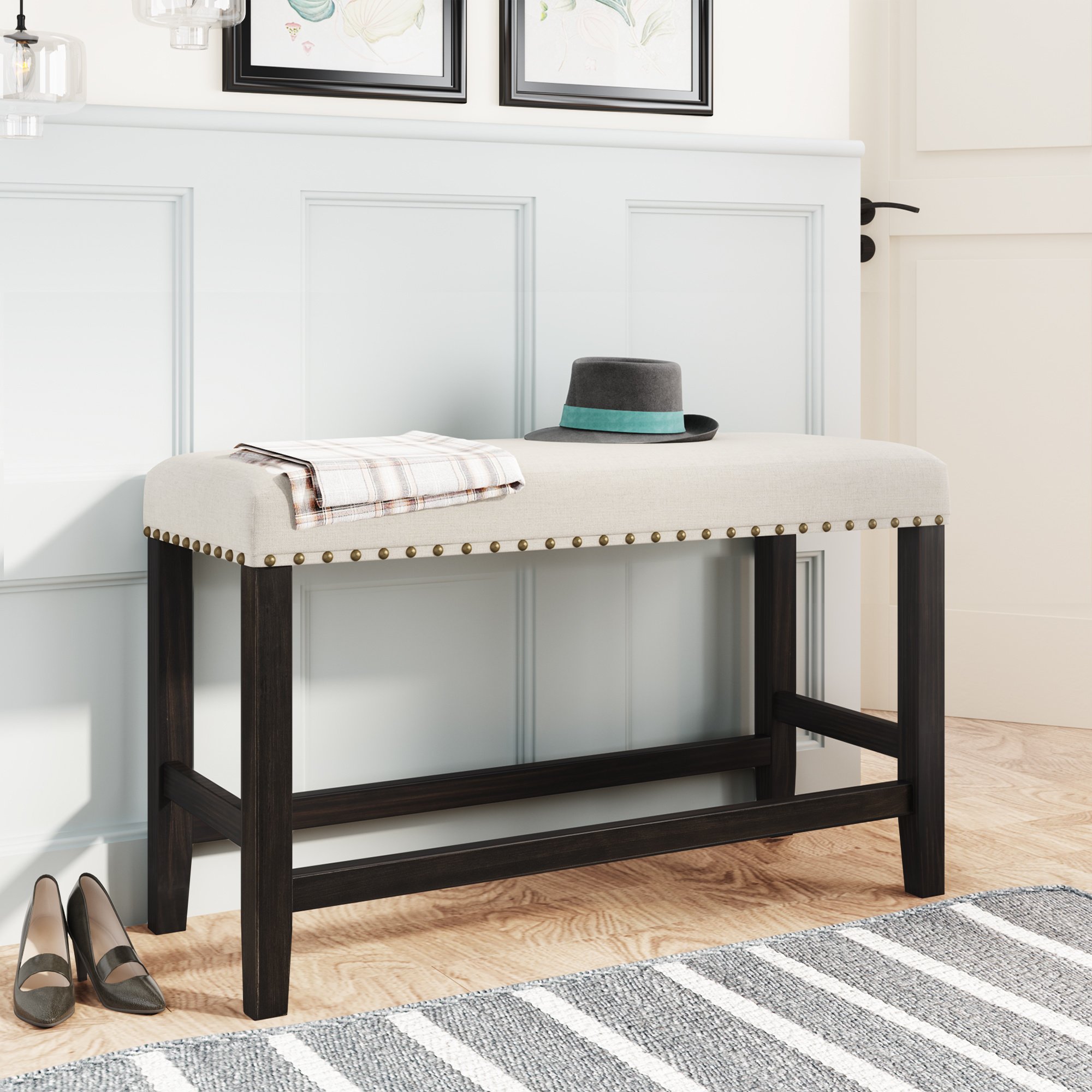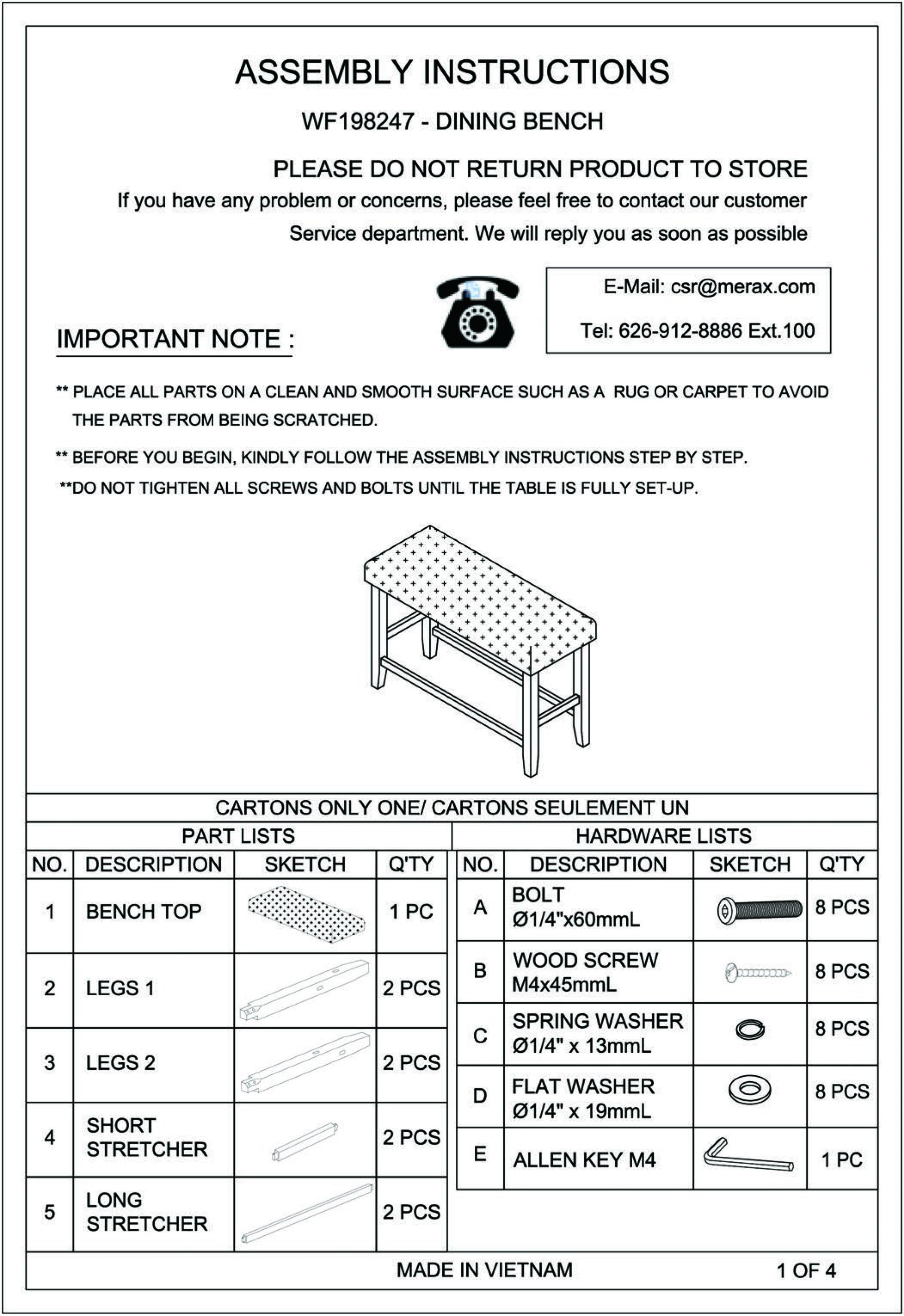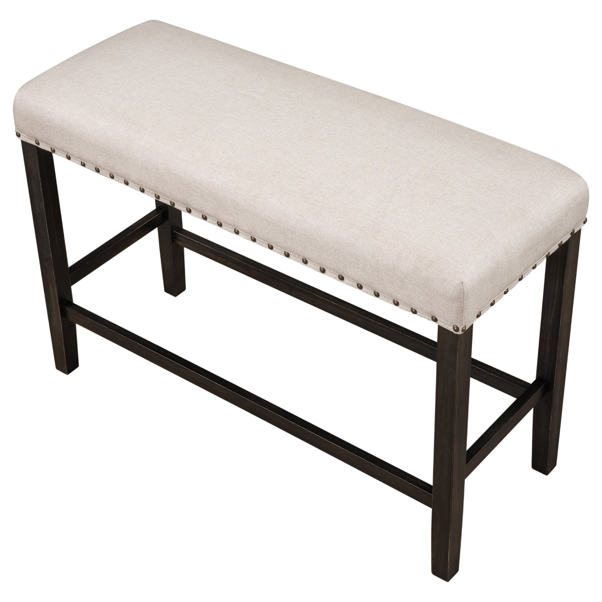 TOPMAX Rustic Wooden Upholstered Dining Bench for Small Places; Espresso+ BeigeBullet Points:Rustic Small Places DesignCome with 1 bench; this graceful padded dining bench is designed for small places. The bench can be stacked under table when not in use to save space. Featuring with rustic espresso coating and beige cushions as well as bronze decorated nails; this kitchen bench will bring a bold but soft presence to any dining room.Premium Wood ConstructionBuilt with high quality solid rubber wood legs; this set is designed to hold 250lbs maximum capacity and last for years. Sturdy stretcher underneath the top provides added durability and offers extra comfort as well as relaxation as a footrest when dining. Breathable and Soft CushionsCompared with other hard seating; both chairs and bench for this dining table set are padded with 4.3-inch thick cushions; make you feel comfortable while can also hold 250lbs maximum capacity.Multifunctional BenchTo offer extra room for small room; the bench can not only be as a dining bench but also be a shoe bench in your entryway which is multifunctional for your home with its upholstered seating.Dimensions and WarrantyDining Bench:38.2x15.2x20.9inch(LXWXH). 12-month warranty. Warm notice that there are1piece in one package.Please feel free to contact us if any issues.NoticeFeedback Request in the Manual. The content is in the following:PLEASE DO NOT RETURN PRODUCT TO STOREIf you have any problem or cncerns; please feel free to contact our customer Service department. We will reply you as soon as possible.