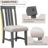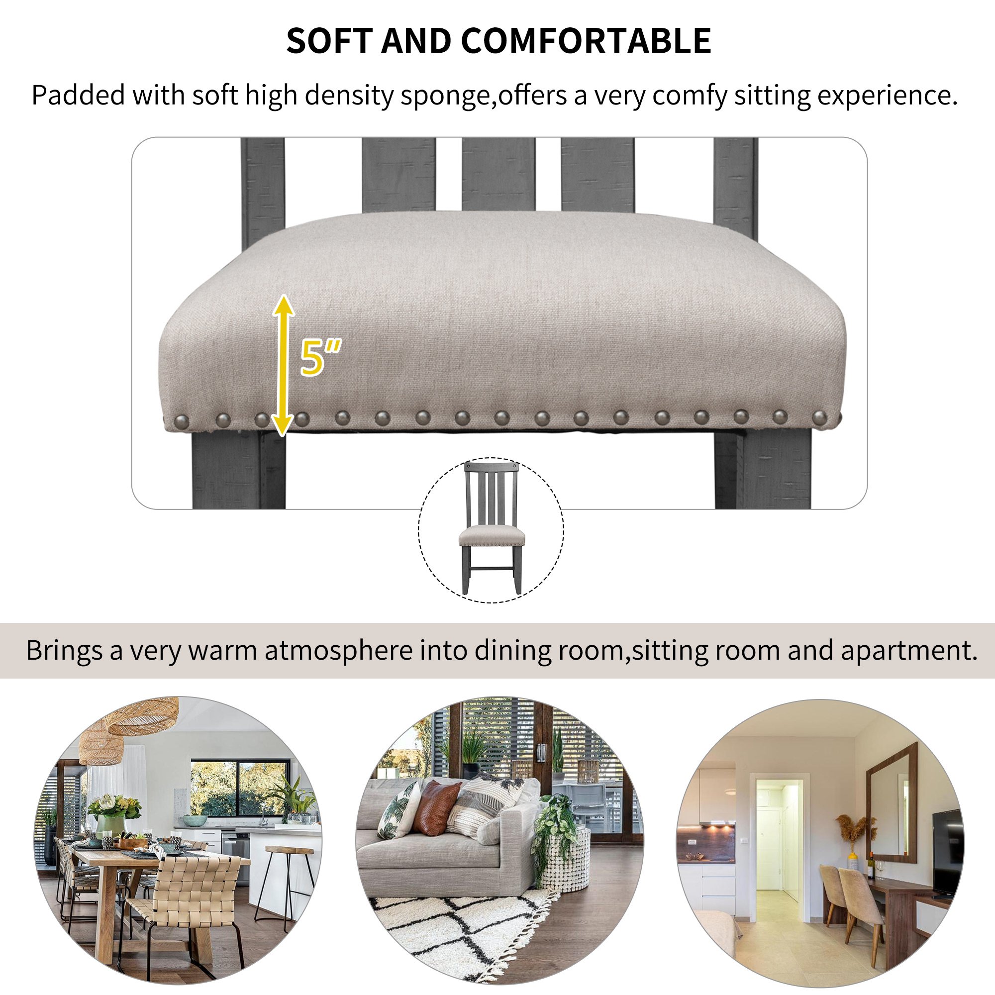 The solid wood surface is full of distressed details; and decorated with two large hardware on the chair back; this chair set brings a retro atmosphere to your space. In addition; fabric seat and nailhead trim add a very contemporary touch into the dining chair set. Rubber feet on the bottom of the legs help protect the floor from scratches. What a perfect choice for hosting elegant dinners!